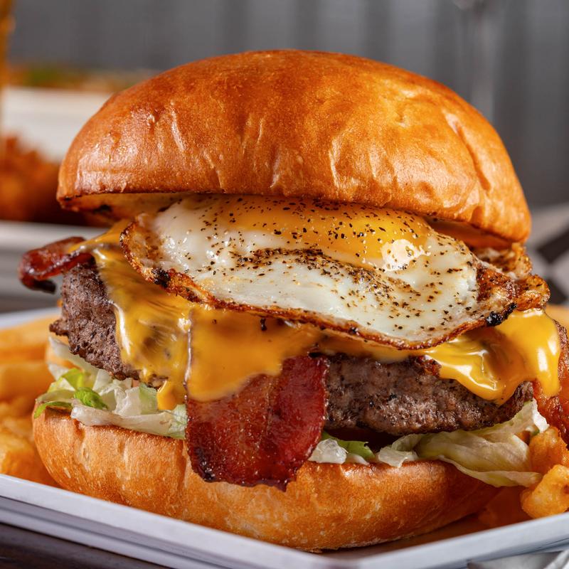1/2 lb. burger topped with American cheese, bacon, fried egg, lettuce, tomato, and mayo.