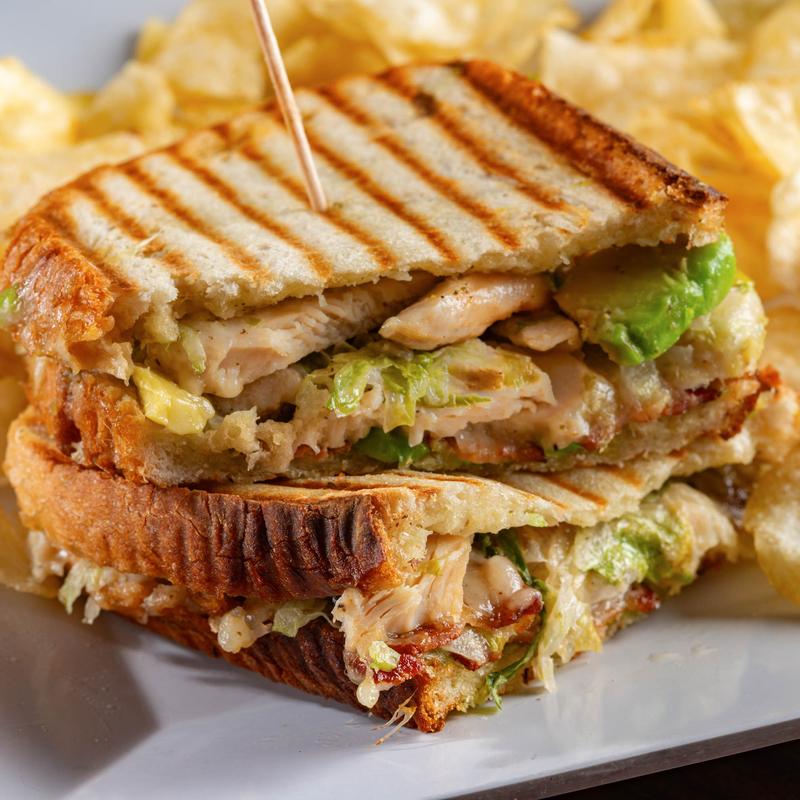 Grilled chicken, sliced avocado, bacon, lettuce, tomato, Swiss cheese, and pesto aioli toasted on panini bread.