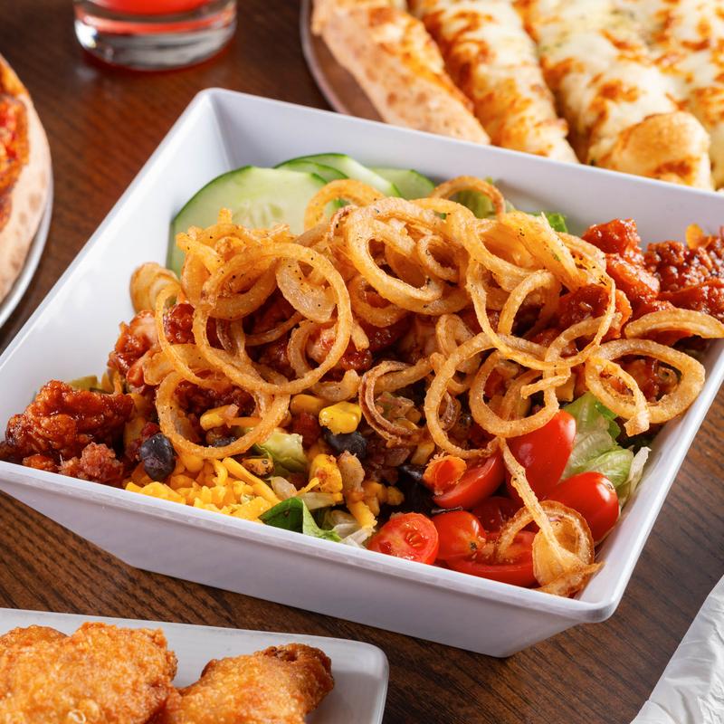 Mixed greens, BBQ boneless bites, cucumbers, black bean and corn salsa, chopped bacon, and Colby cheese. Topped with crispy onion straws and served with a BBQ ranch dressing.