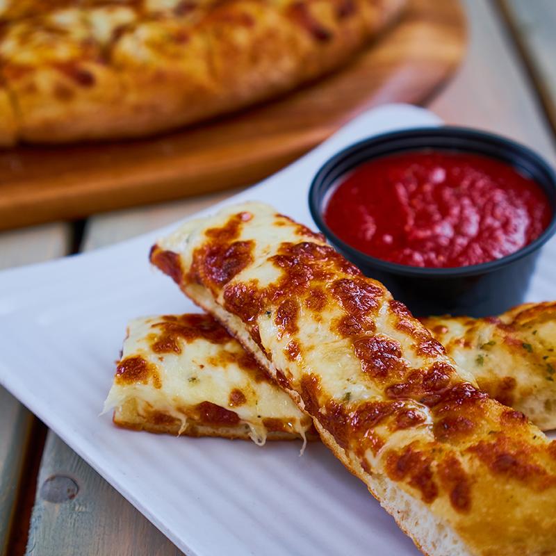 Freshly baked breadsticks, brushed with garlic butter and topped with Mozzarella, Colby, and Parmesan cheese. Served with pizza sauce.