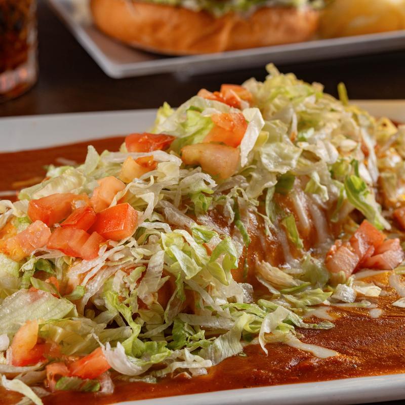 Soft tortilla shell stuffed with your choice of meat and/or beans with lettuce and fresh tomatoes. Smothered with housemade burrito sauce and Colby cheese | Beef & Bean $13.00 | Beef $14.00 | Chicken $14.00