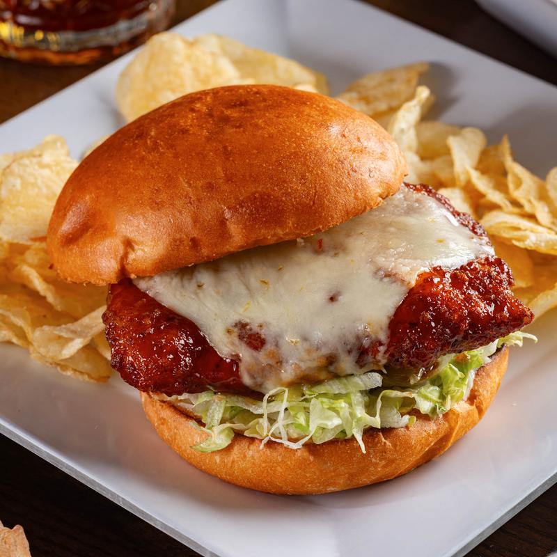 Tender chicken breast, lightly breaded and tossed in hot honey BBQ sauce. Served on a bun with lettuce, pickles, and mayo.