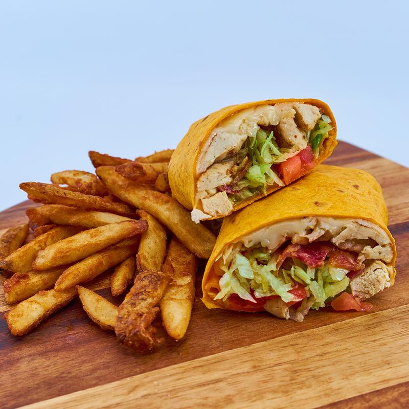 Boneless bites, lettuce, tomato, Colby cheese, with your choice of Buffalo sauce or ranch dressing in a jalapeño cheddar wrap.
